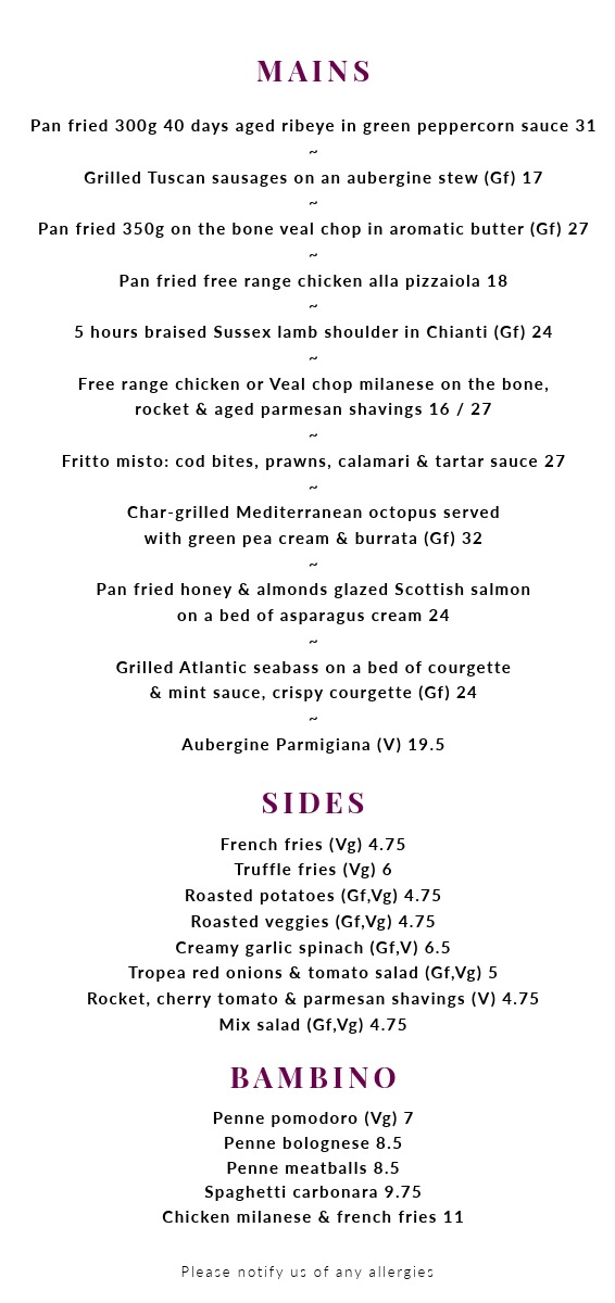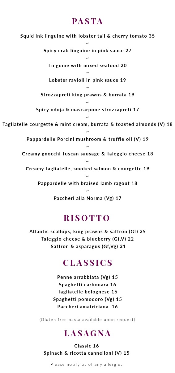 Guests often find themselves starting with light nibbles like freshly baked focaccia or creamy burrata, setting the tone for a leisurely dining experience. Pasta lovers will appreciate dishes such as ravioli, squid ink linguine with lobster tail, or the rich pappardelle with braised lamb ragout, while mains like veal scaloppine with wild mushroom sauce and sea bass offer satisfying options for those seeking something more substantial.